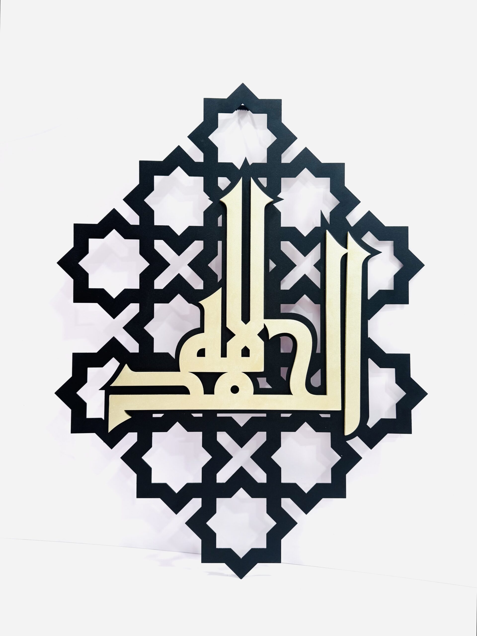Nafis arab xattotligi va geometrik naqshlarni uyg‘unlashtirgan Islomiy uslubda yaratilgan devor bezagi. Markaziy element asosida Allohning birligini bildiruvchi Alloh lafzi bitilgan. Detallarning aniqligi va chidamlilikni ta’minlash uchun lazerda kesish yordamida foydalanilib, sifatli materiallardan tayyorlangan. Zamonaviy yoki an’anaviy sharqona uslubda interyerni bezashda to’g’ri keladi.