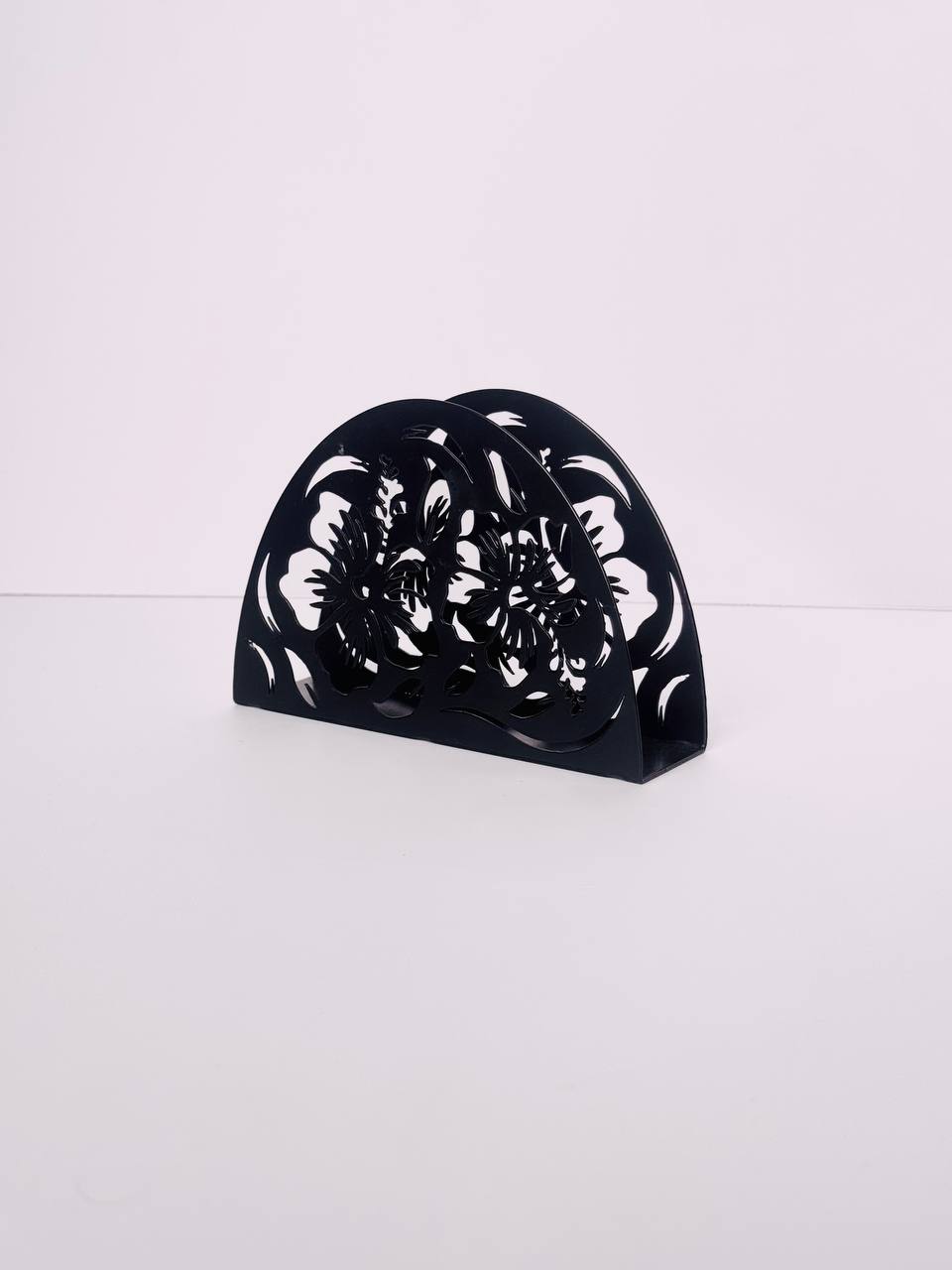 Gullar naqshidagi qora metall salfetka ushlagichi. Stolingizga nafislik qo‘shadi va interyer go‘zalligini ta’kidlaydi. Kundalik foydalanish va maxsus tadbirlar uchun mos.